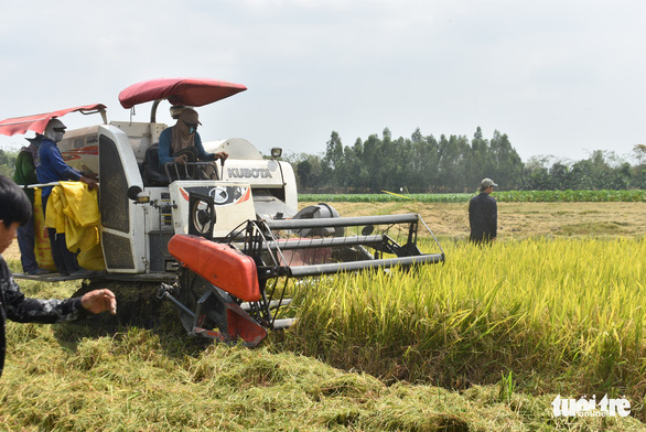 Lúa ông Bé đang thu hoạch bán với giá 4.600 đồng/kg khiến ông lỗ nặng vì doanh nghiệp không thu mua như hợp đồng đã ký - Ảnh: Bửu Đấu