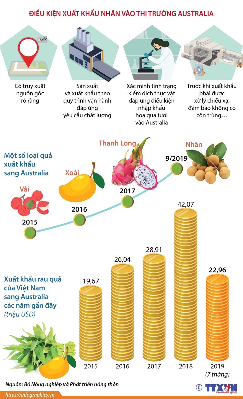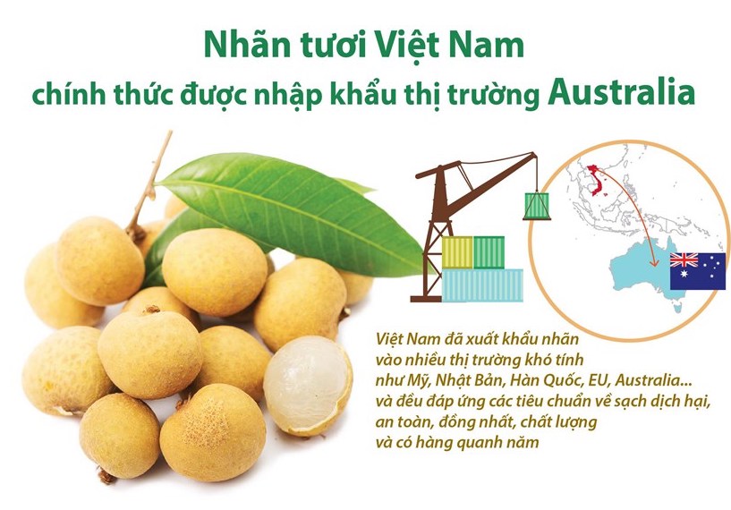 Tiếp theo vải, xoài và thanh long, Australia chính thức cấp phép cho quả nhãn của Việt Nam vào thị trường nước này và chiều 6/9, lô hàng đầu tiên đã chính thức được nhập khẩu vào Australia.