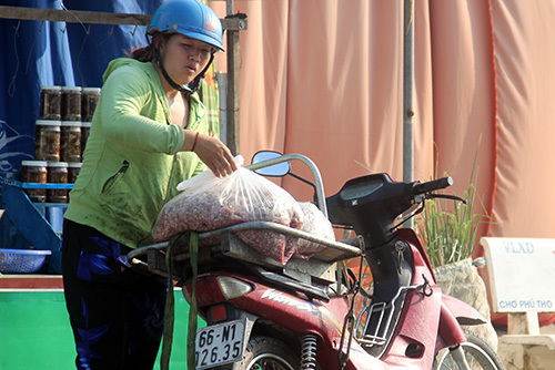 "Mỗi ngày cơ sở của tôi tiêu thụ khoảng 800 - 900 kg cá lóc nguyên liệu để làm khô, thải ra khoảng 70 – 80 kg vảy cá", ông Nguyễn Văn Năm nói và cho biết nhiều năm qua, số phế phẩm này phải đổ xuống kênh chứa ở bãi đất trống sau nhà rất hôi thối. Nhưng từ Tết đến nay có thương lái từ xa đến thu mua, nên người dân rất mừng.